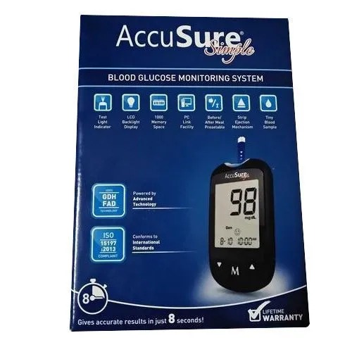 AccuSure Sensor Blood Glucose Monitoring System is a convenient way to measure the blood glucose level of the body. The device contains 1000 memory positions, reminder alarms, and warning for high ketones. Moreover, it only requires a tiny blood sample in order to provide accurate results in five seconds.